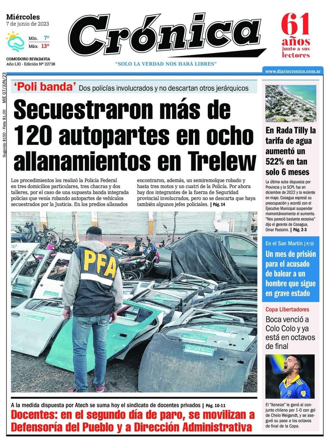 Crónica destaca que secuestraron más de 120 autopartes en ocho allanamientos en Trelew.