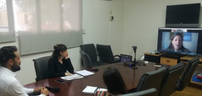 El ministro Leandro Cavaco, mantuvo un encuentro online con la directora ejecutiva, Alejandra Conconi. Acompañado por la subsecretaria de Industria, Nadine Serón, el representante de la Agencia de Comercio Exterior Chubut Al Mundo, Eduardo Arzani, y la directora de Comercio Exterior, Estela Lioi.