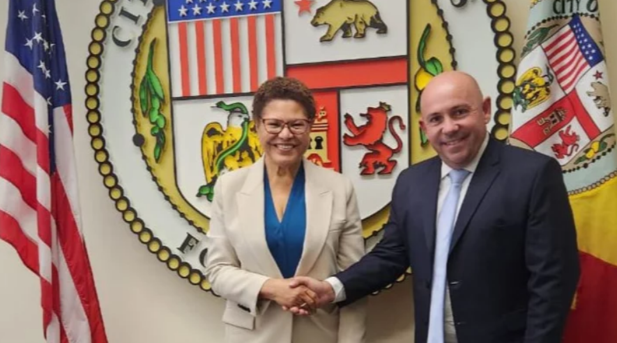 Gustavo Sastre fue recibido en Los Ángeles por la alcaldesa Karen Bass, una de las personalidades más importantes del estado de California, en Estados Unidos.