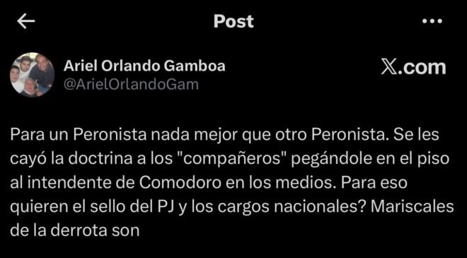 “La doctrina se les cayó a los ‘compañeros’ pegándole en el piso al intendente de Comodoro en los medios”, disparó Gamboa, en una crítica directa a la estrategia de confrontación interna contra la gestión municipal que encabeza Othar Macharashvili.