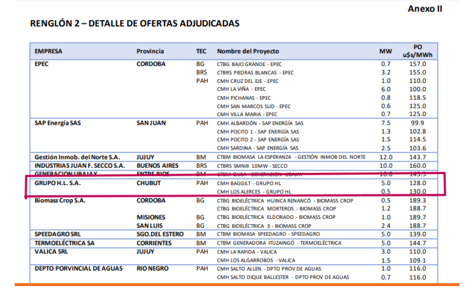 Según la información técnica de la Secretaría de Energía, los dos proyectos de Lewis en Chubut son con una capacidad de generación de 5 megas (Baggilt) y 0,5 megas (Los Alerces).