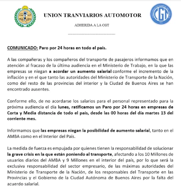“Las empresas se niegan a acordar un aumento salarial conforme el incremento de la inflación y en el que tanto las autoridades del Ministerio de Transporte de la Nación, como del resto de las provincias del interior y la Ciudad de Buenos Aires se han encontrado ausentes”.