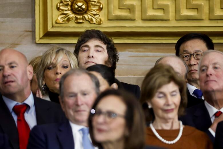 Milei siguió la jura de Trump entre los invitados en el escenario montado en la Rotonda del Congreso, sentado en la última fila, detrás de los expresidentes Bill Clinton, Barack Obama y George W. Bush, y al lado de los jueces de la Corte Suprema de Justicia.