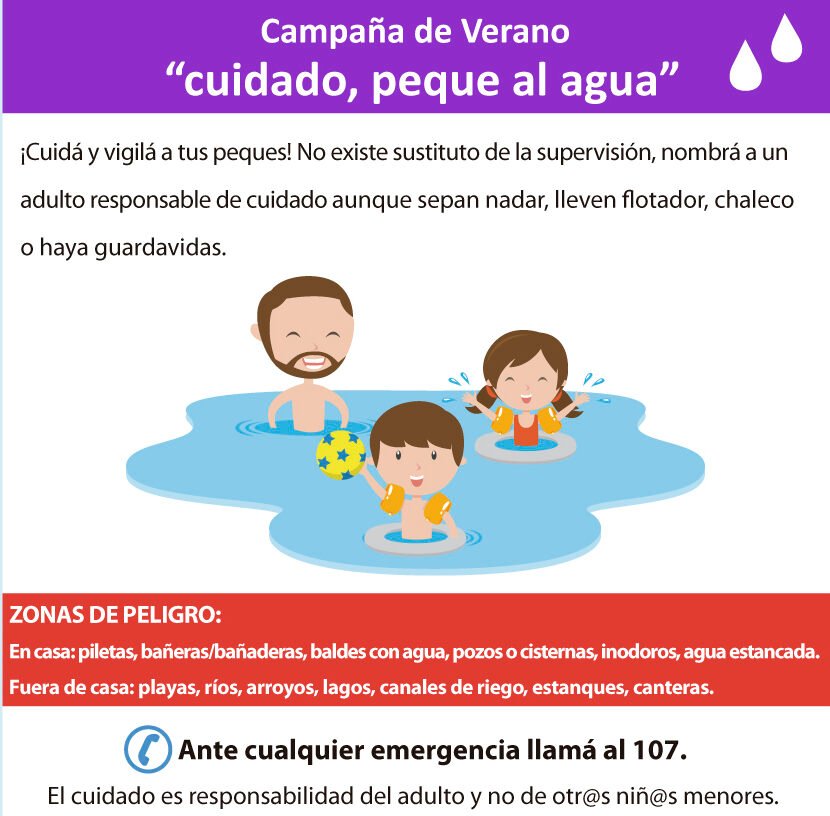 La jefa del Departamento Provincial de Salud del Niño, Paula Martínez, alertó que “bastan diez centímetros de cualquier colección de agua y menos de un minuto para que corra riesgo todo niño o niña, por lo cual es fundamental que haya siempre un adulto responsable supervisando los juegos de los chicos”.