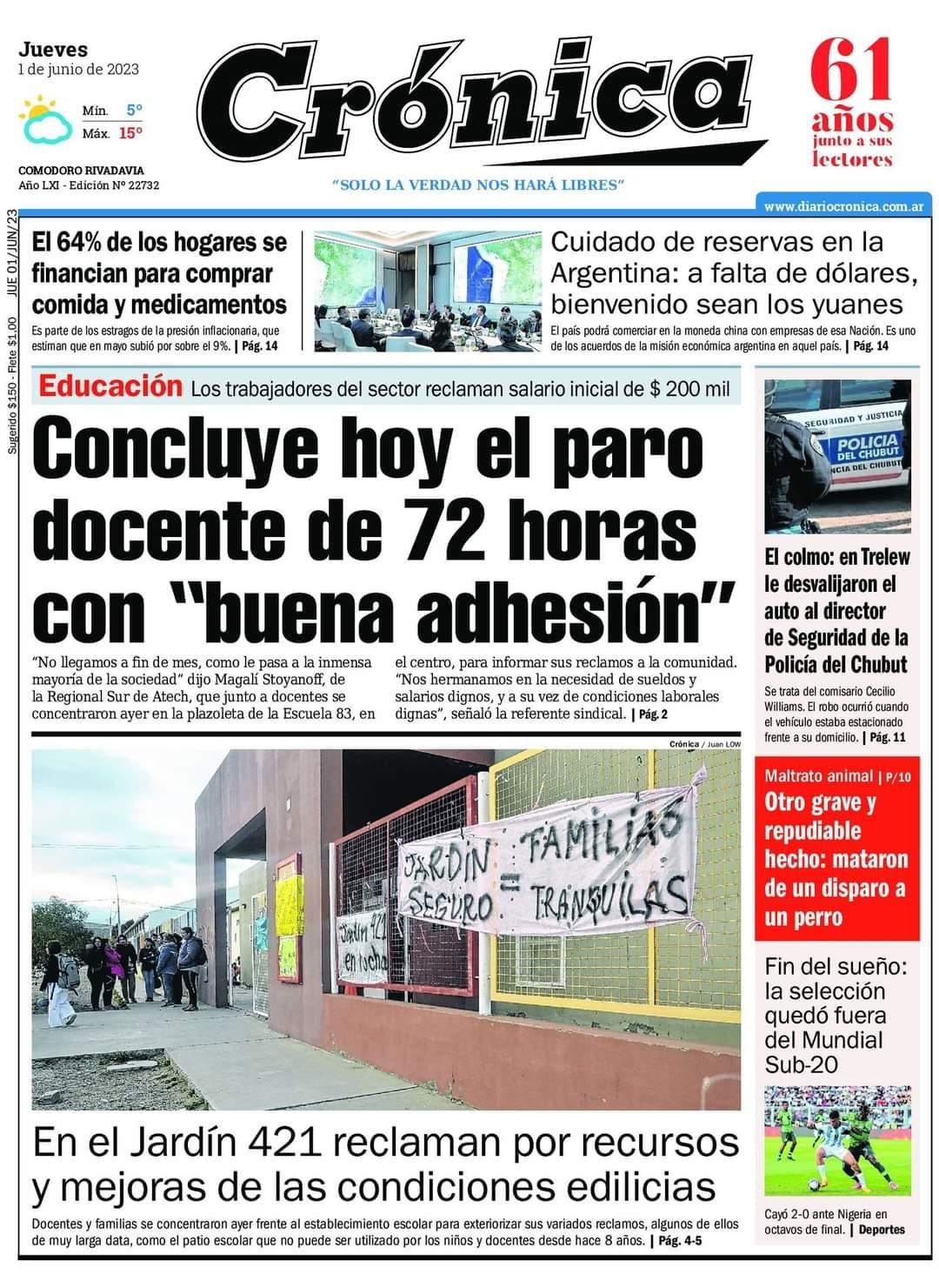 Crónica destaca que concluye hoy el paro docente de 72 hs con «buena adhesión».