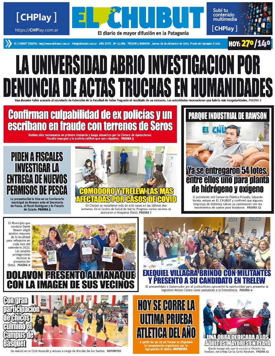 En la «causa Seros» confirmaron la condena a 2 comisarios retirados y a un escribano de Trelew. La Universidad San Juan Bosco abrió una investigación por una denuncia de falsificación de actas para una designación docente. Avanza la denuncia del ministro del Superior Tribunal de Justicia, Daniel Báez, por “falsedad ideológica” en un Concurso para el cargo de auxiliar del Juzgado de Paz de Gastre.