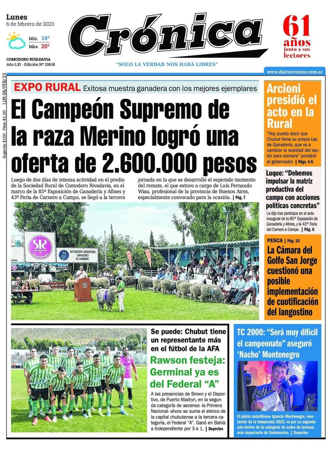 Crónica destaca que el campeón supremo de la raza merino logró una ofretar de 2.600.000 pesos.
