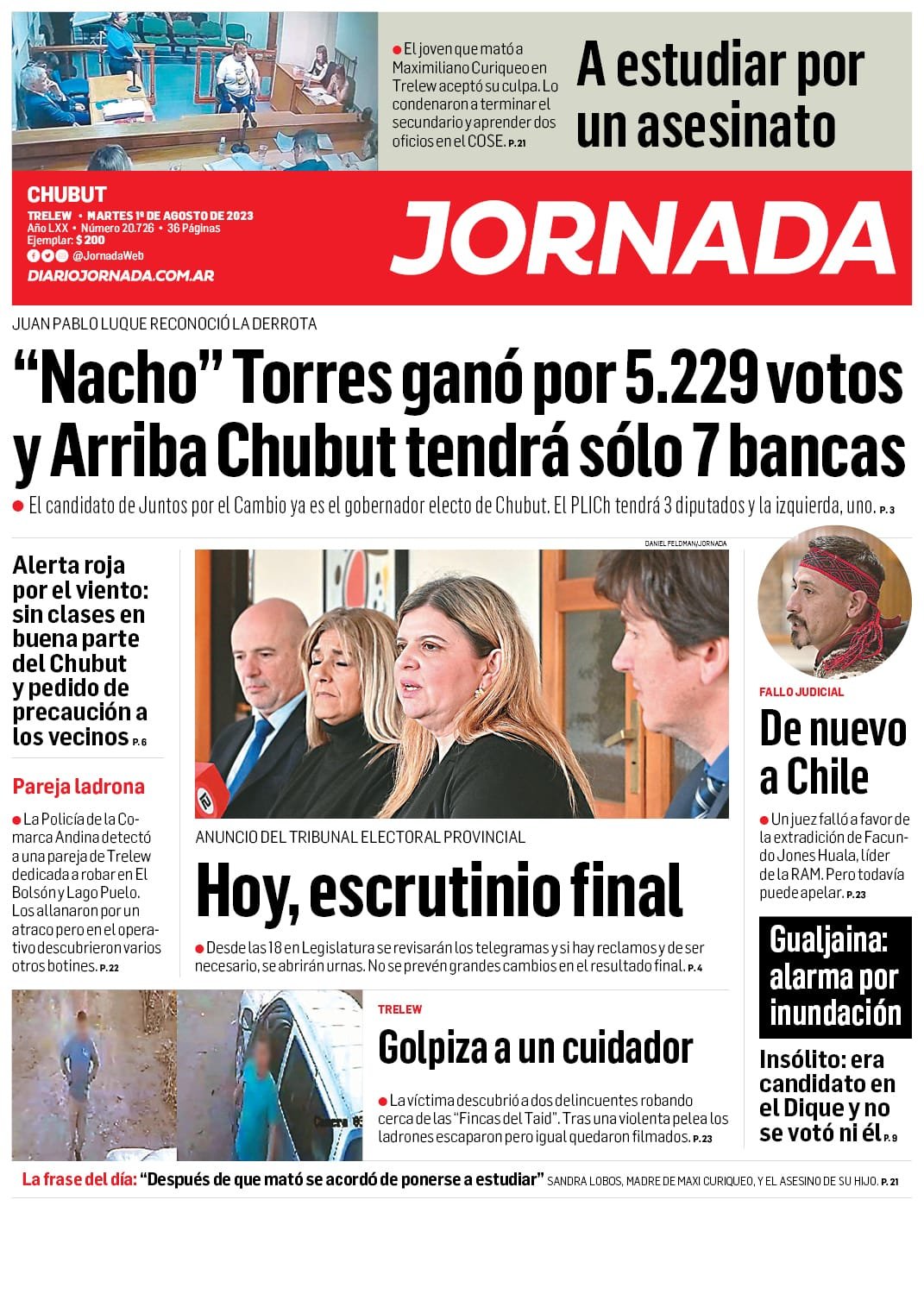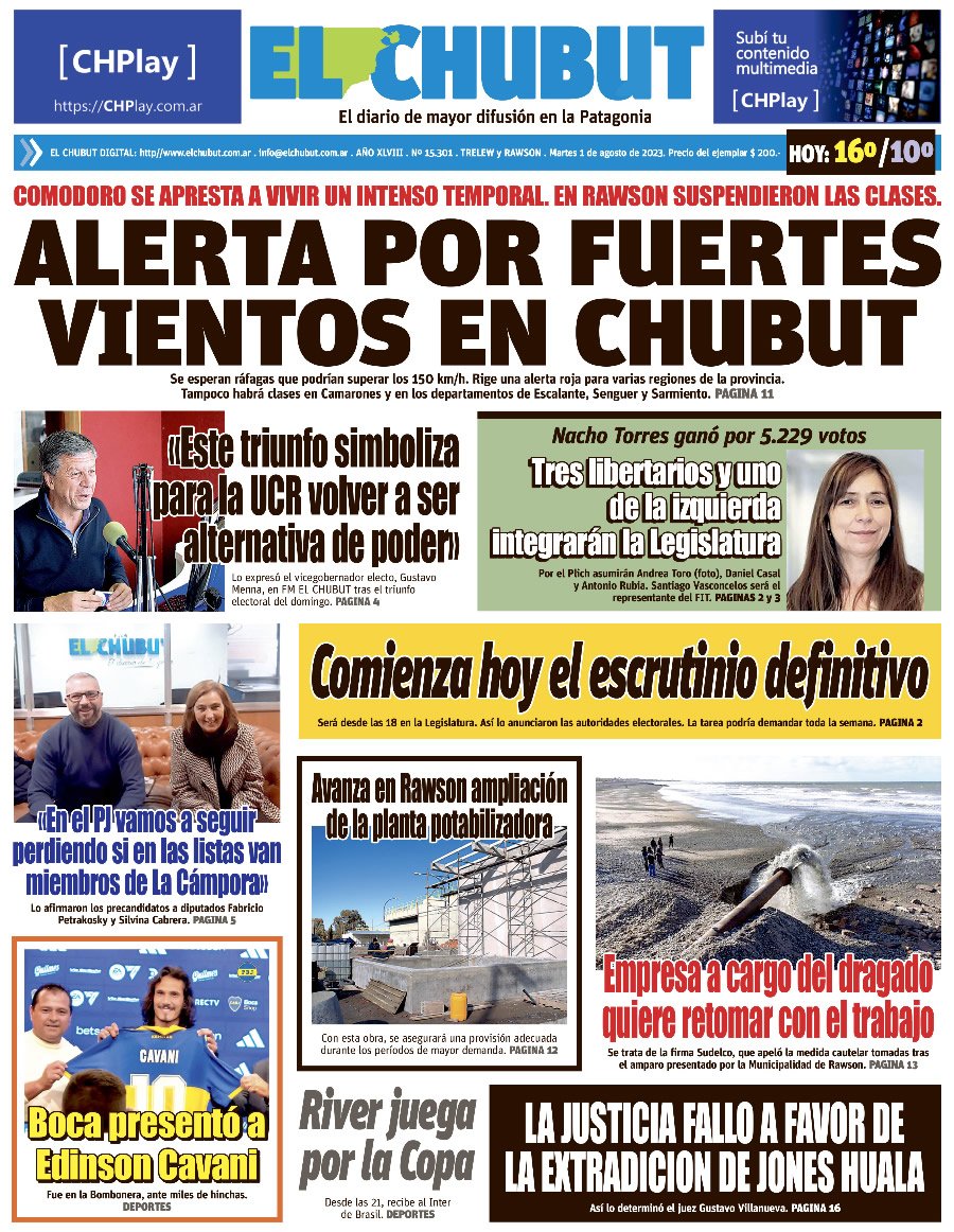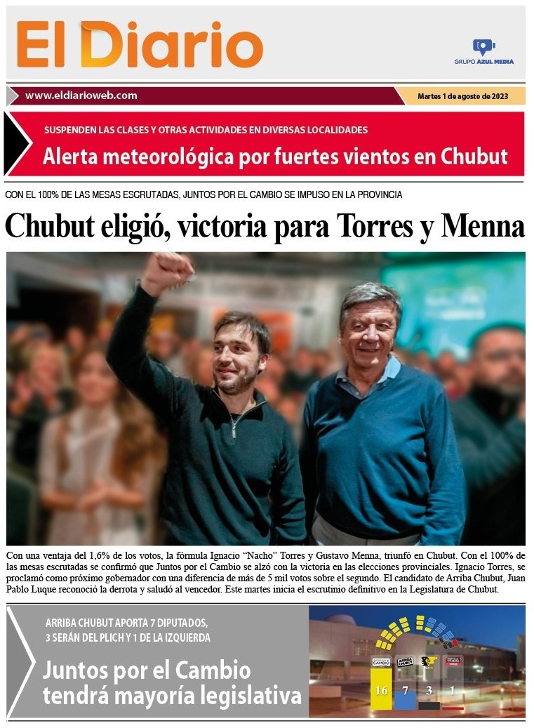 El Diario resalta que Chubut eligió, victoria para Torres y Menna.