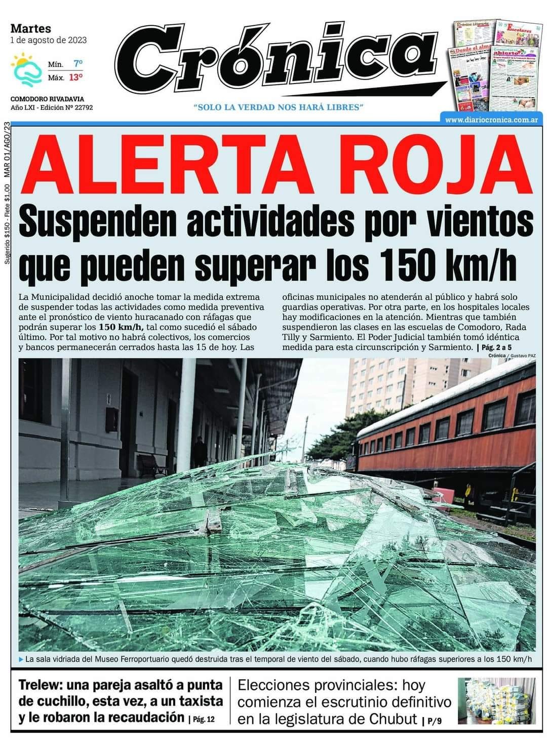 Hay alerta roja en varias zonas de Chubut por fuertes ráfagas de viento. En Comodoro, Rada Tilly y Sarmiento no habrá clases y cierran su atención al público el Banco Chubut y también el Poder Judicial.