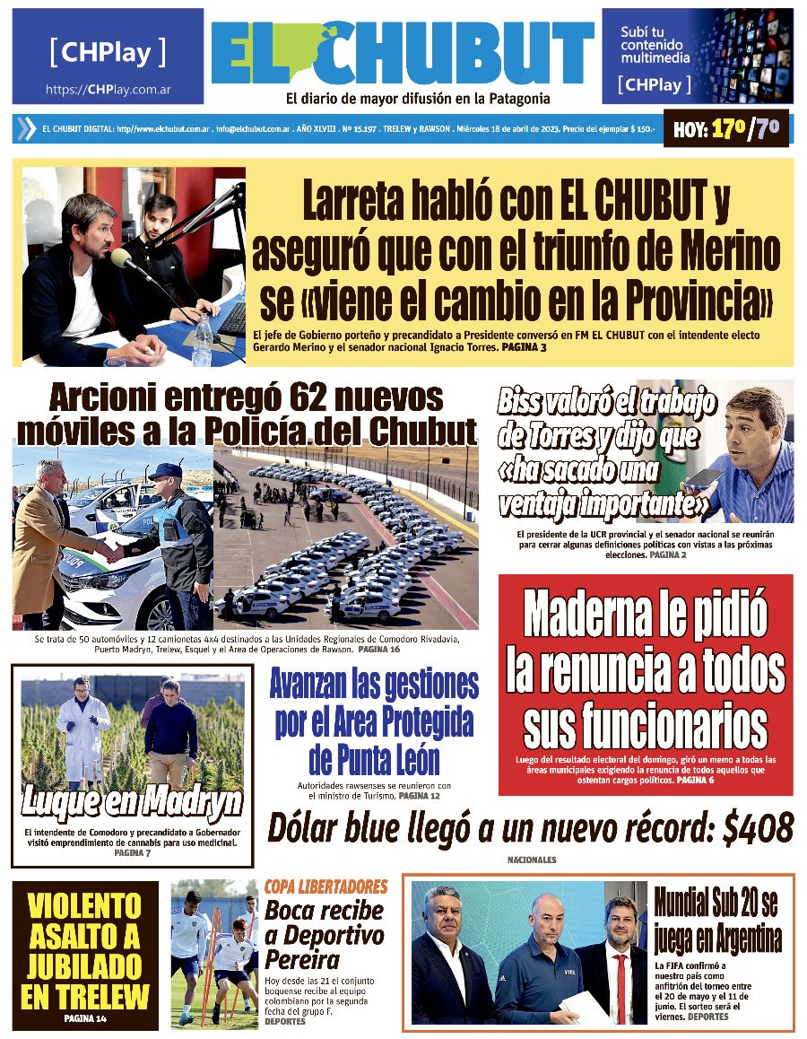 El gobernador Mariano Arcioni entregó más de 60 móviles a la Policía del Chubut. El gobierno provincial lanzó el programa de vinculación entre PyMEs y escuelas técnicas. También acordó con cereceros un plan de acciones para el sector. Asumió la nueva directora del Hospital de Dolavon.