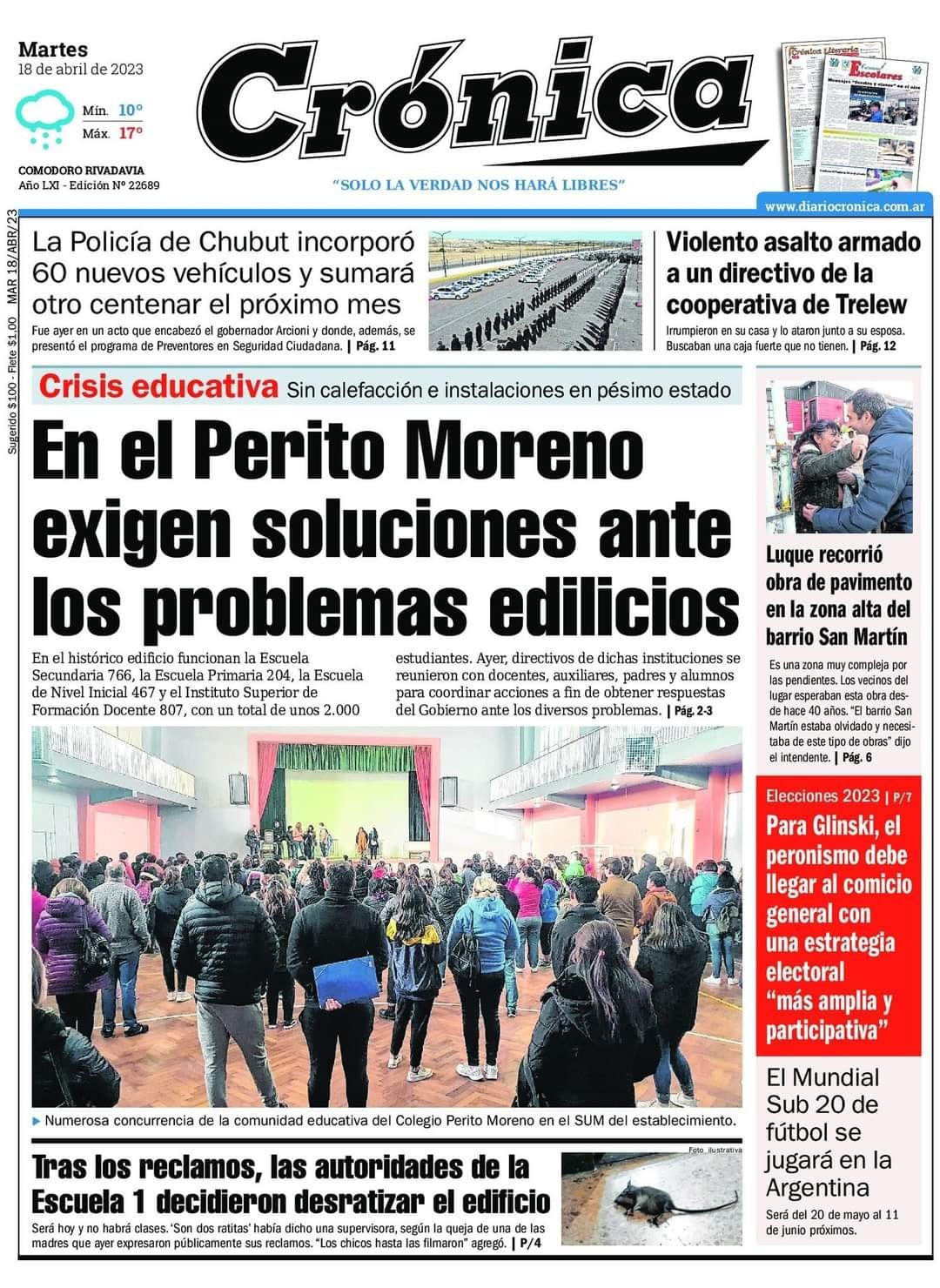 Crónica destaca que en el Perito Moreno exigen soluciones a los problemas edilicios.