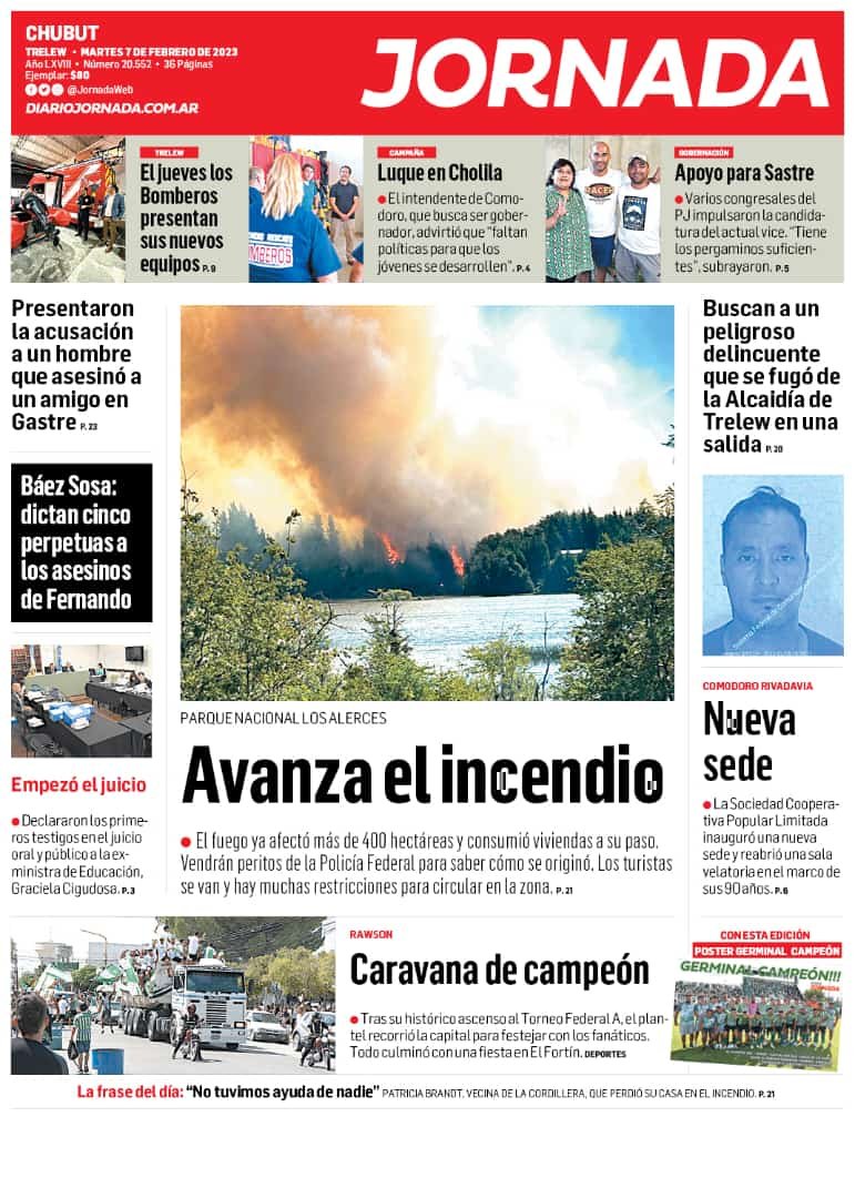 El nuevo incendio en el parque nacional Los Alerces es el tema del día. Ya son más de 900 hectáreas consumidas por el fuego y trabajan más de cien brigadistas y bomberos, asistidos por brigadistas venidos de Neuquén. El gobierno nacional aportó un helicóptero Chinook, con capacidad de arrojar 10 mil litros de agua. El incendio tapó de humo Esquel.