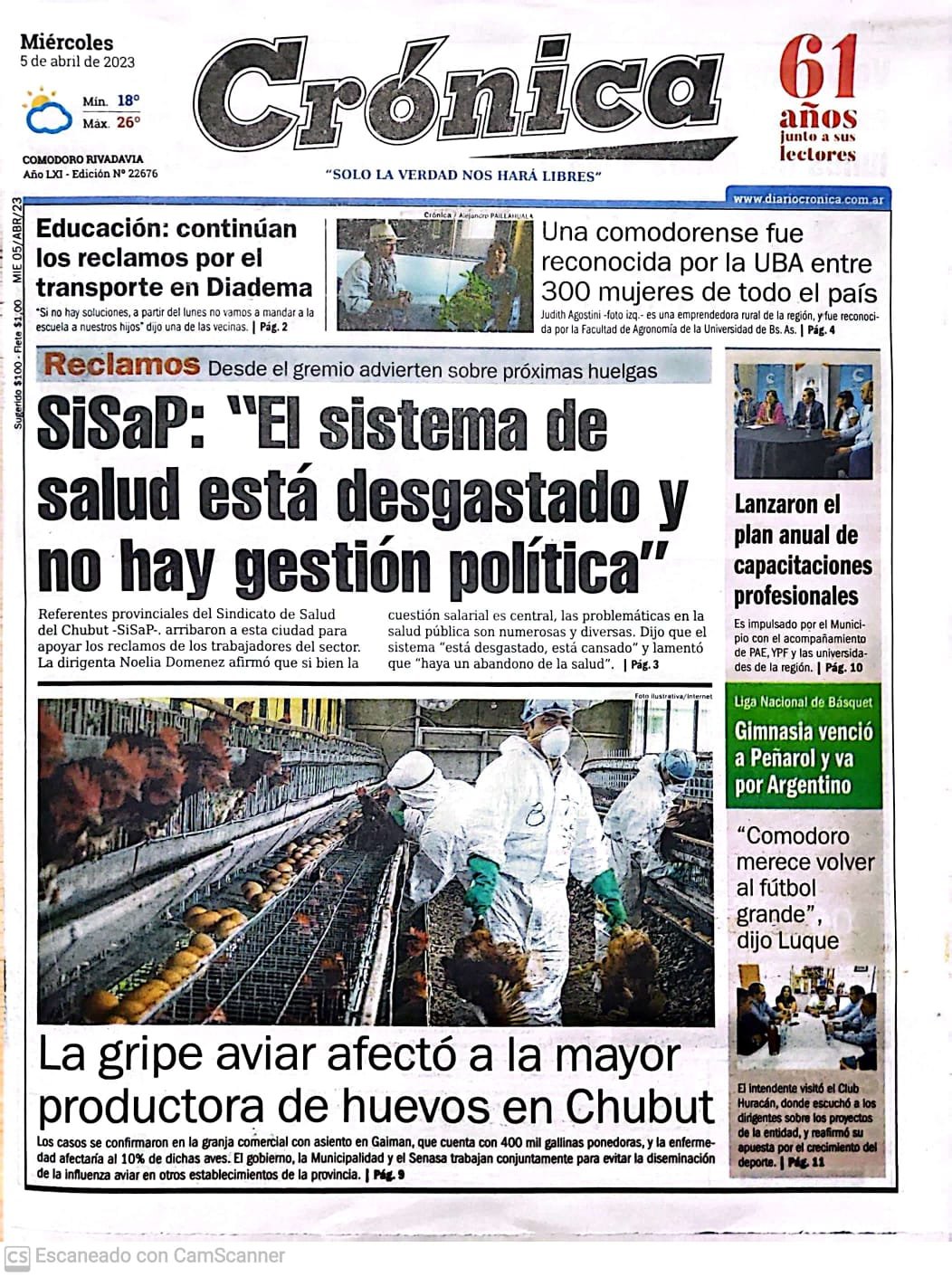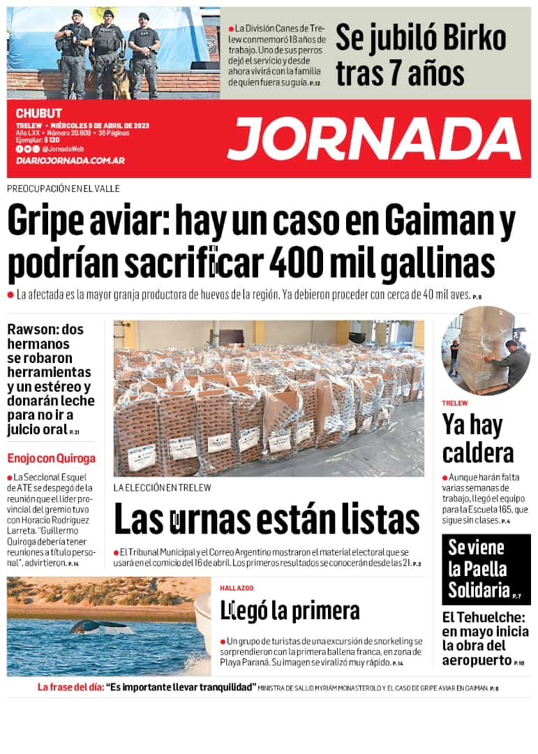 Jornada muestra la Gripe aviar: hay un caso en Gaiman y podrían sacrificar 400 mil gallinas.